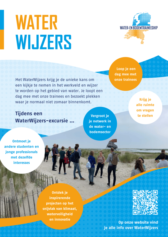Ben jij student of startende professional en benieuwd of een traineeship in de water- en bodemsector bij je past? Met WaterWijzers krijg je de unieke kans om een dag mee te lopen met onze trainees en achter de schermen te kijken bij impactvolle projecten, zoals de Maeslantkering of het sluizensysteem van de Afsluitdijk.